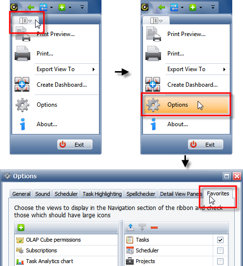 - Click Application Menu, click Options, and then in the Options dialog box, click the Favorites tab.