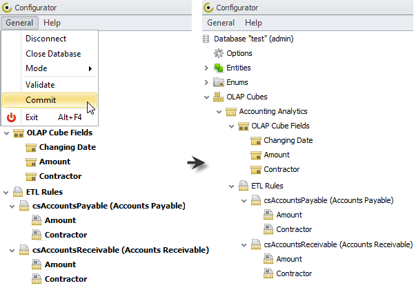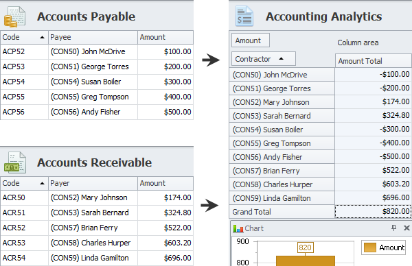 For example, you can monitor financial balance of your company with help of OLAP Cube that extracts data from entity views “Accounts Payable” and “Accounts Receivable”, transforms data by entering “Accounts Payable” amounts as negative values, and loads data into analytic view “Accounting Analytics”.