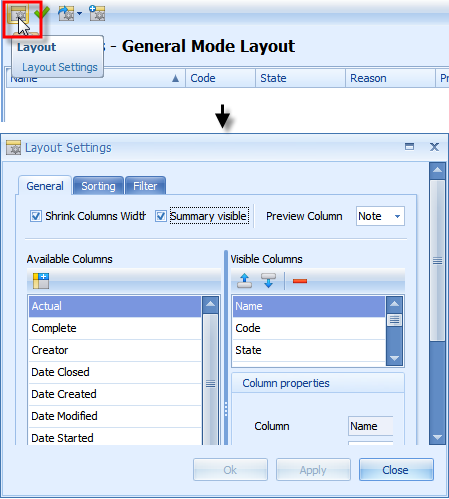4. Click Layout to set layout and filters.