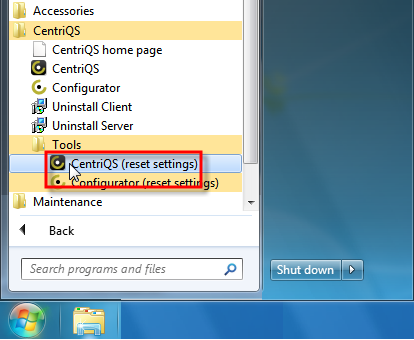 2. Click Start, point to All Programs, click the CentriQS folder, click the Tools folder, and then click CentriQS (reset settings).