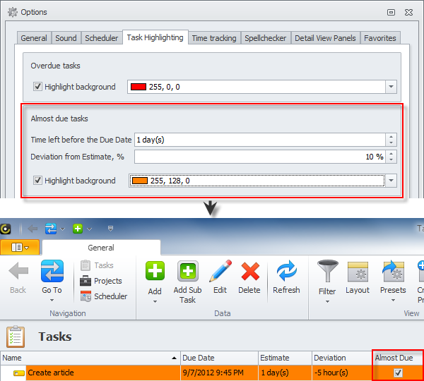 Be aware of almost due tasks depending on time left before due date or deviation from estimate (screenshot)