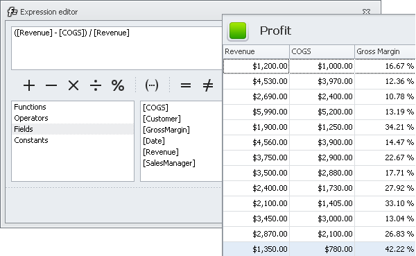 Use variety of functions, operators, constants and properties to set flexible formulas (screenshot)