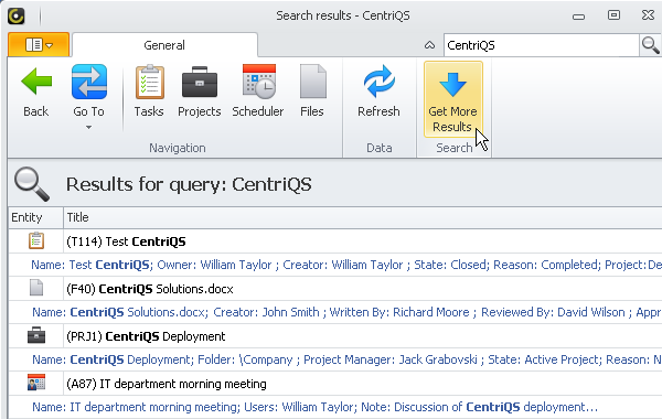 Find all required data, such as tasks, projects, files, etc. by any keywords or key phrases (screenshot)