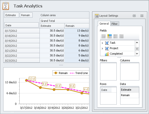 Use pivot grid and charts (including burndown chart) to measure your company performance (screenshot)